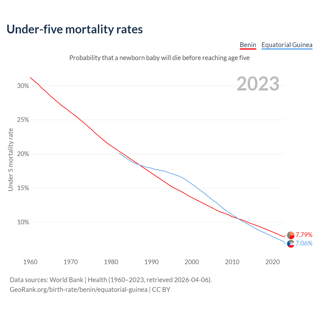 The chance that a newborn baby will die before reaching age five is 7.79% in Benin and 7.06% in Equatorial Guinea. Above is a chart with historical data on under-five mortality rates.