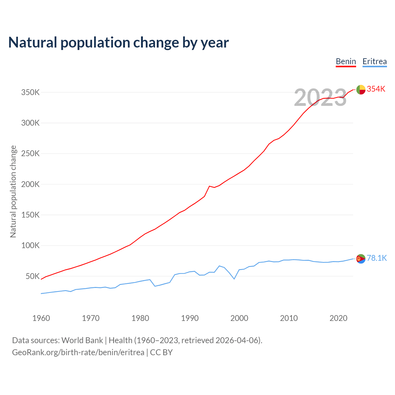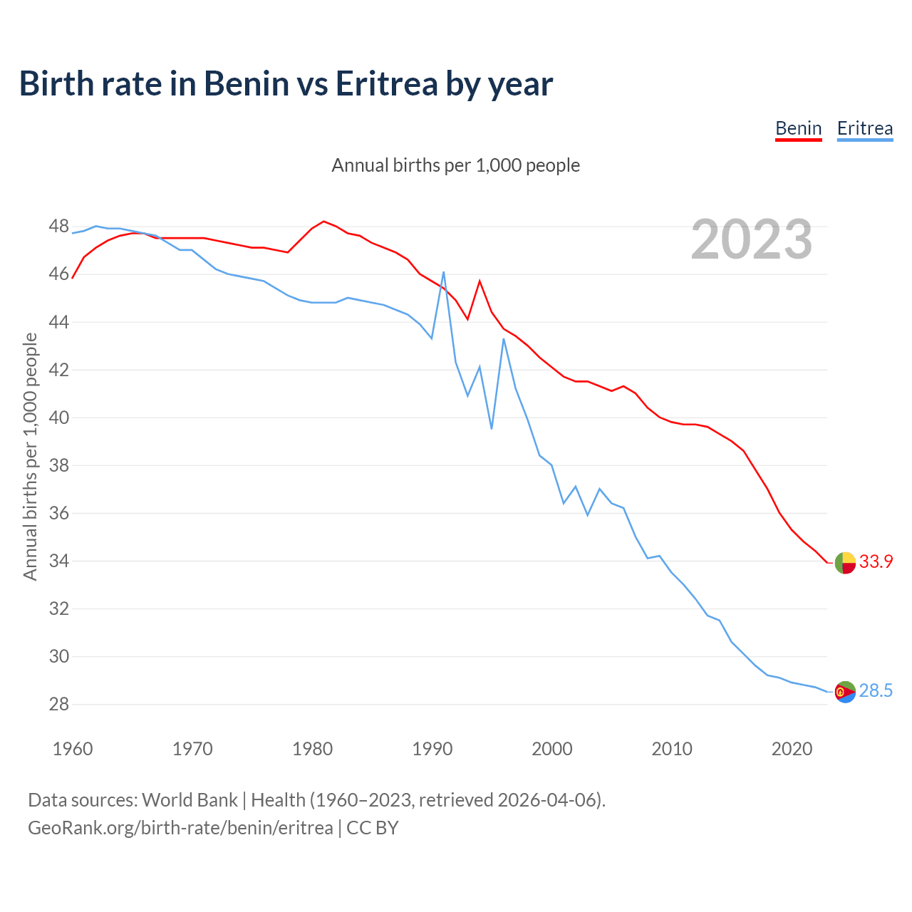 Benin has an annual birth rate of 33.9 births per 1,000 people, compared to 28.5 for Eritrea. The average number of children a woman is expected to have during her lifetime — the fertility rate, is 4.56 in Benin and 3.71 in Eritrea — 18.5% difference.