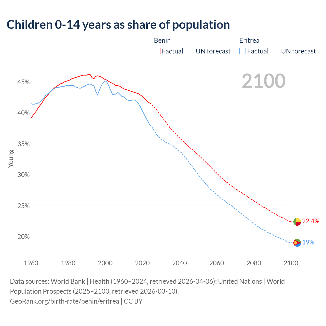According to the latest available data on birth rates, the fertility rate in Benin was 4.56 children per woman in 2023, compared to 3.71 in Eritrea in 2023. The replacement level is considered to be 2.1 children per woman.
