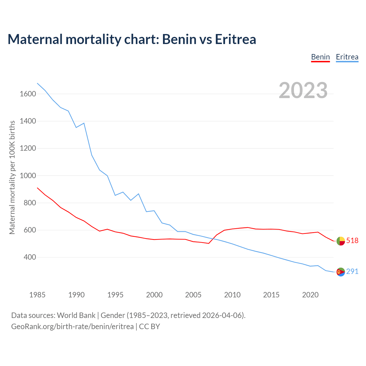 The maternal mortality rate, which is the probability of dying during childbirth or within 42 days of pregnancy termination, is 518 deaths per 100,000 live births in Benin, compared to 291 deaths in Eritrea.