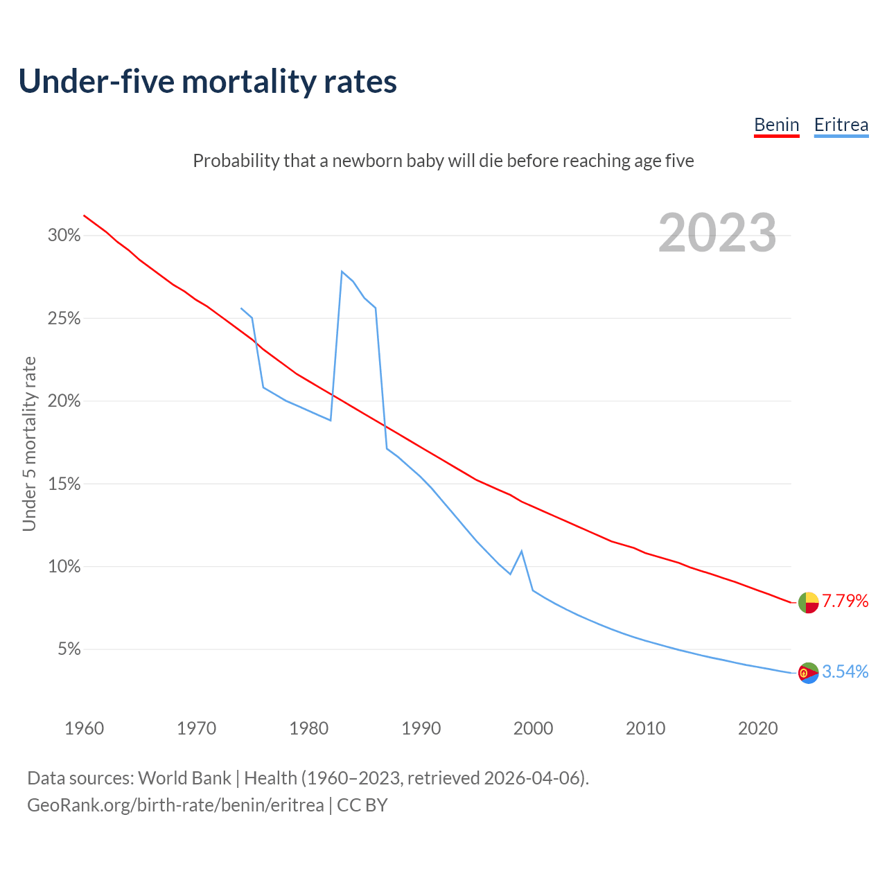 The chance that a newborn baby will die before reaching age five is 7.79% in Benin and 3.54% in Eritrea. Above is a chart with historical data on under-five mortality rates.