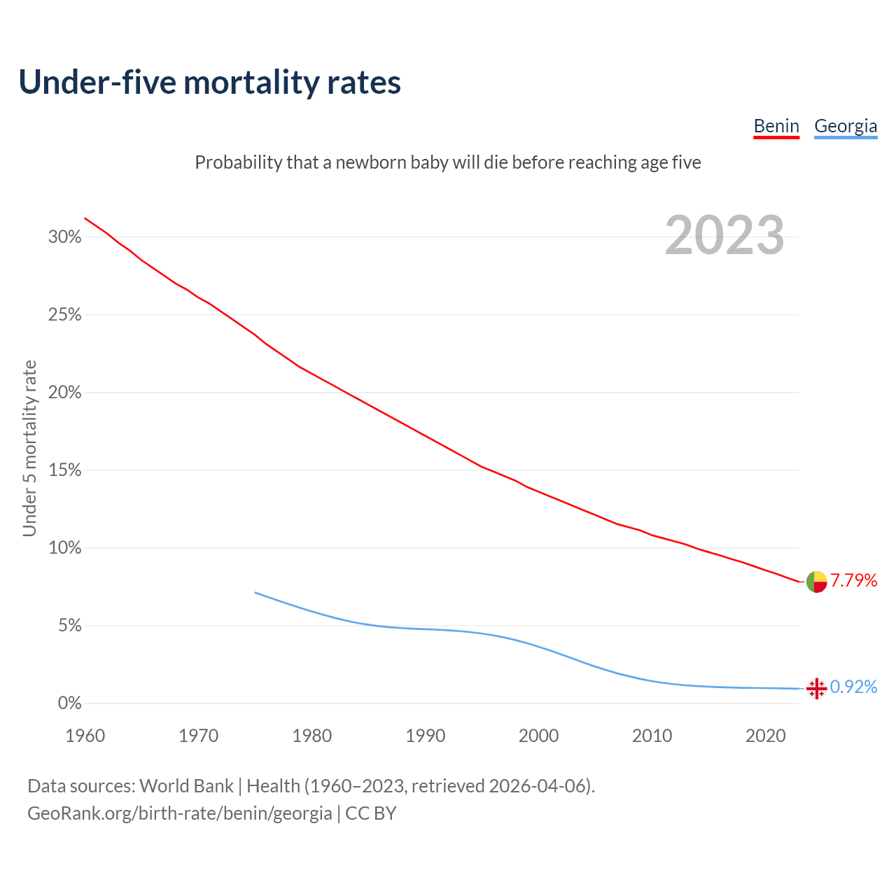 The chance that a newborn baby will die before reaching age five is 7.79% in Benin and 0.92% in Georgia. Above is a chart with historical data on under-five mortality rates.