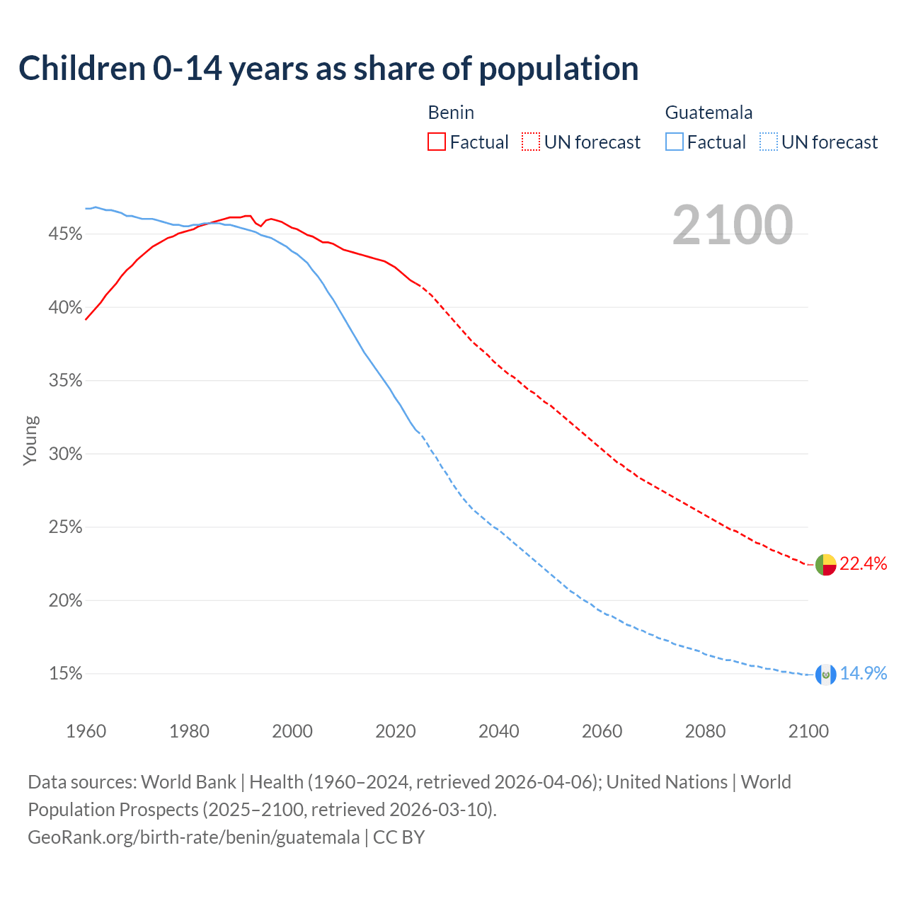According to the latest available data on birth rates, the fertility rate in Benin was 4.56 children per woman in 2023, compared to 2.31 in Guatemala in 2023. The replacement level is considered to be 2.1 children per woman.