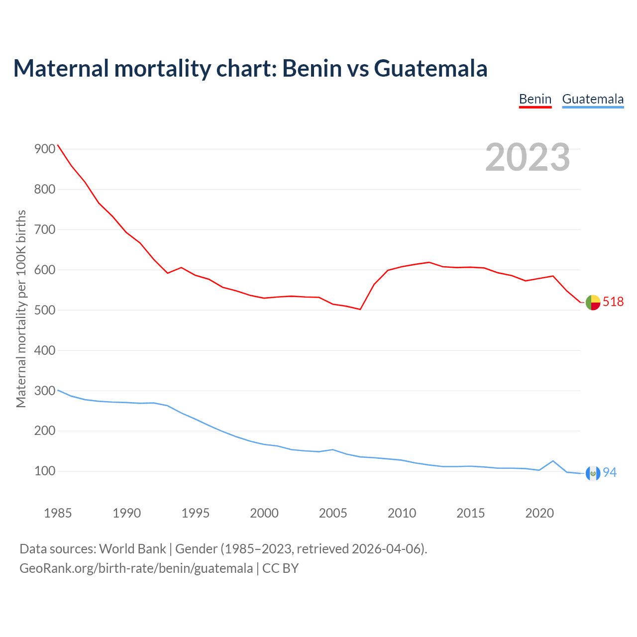 The maternal mortality rate, which is the probability of dying during childbirth or within 42 days of pregnancy termination, is 518 deaths per 100,000 live births in Benin, compared to 94 deaths in Guatemala.