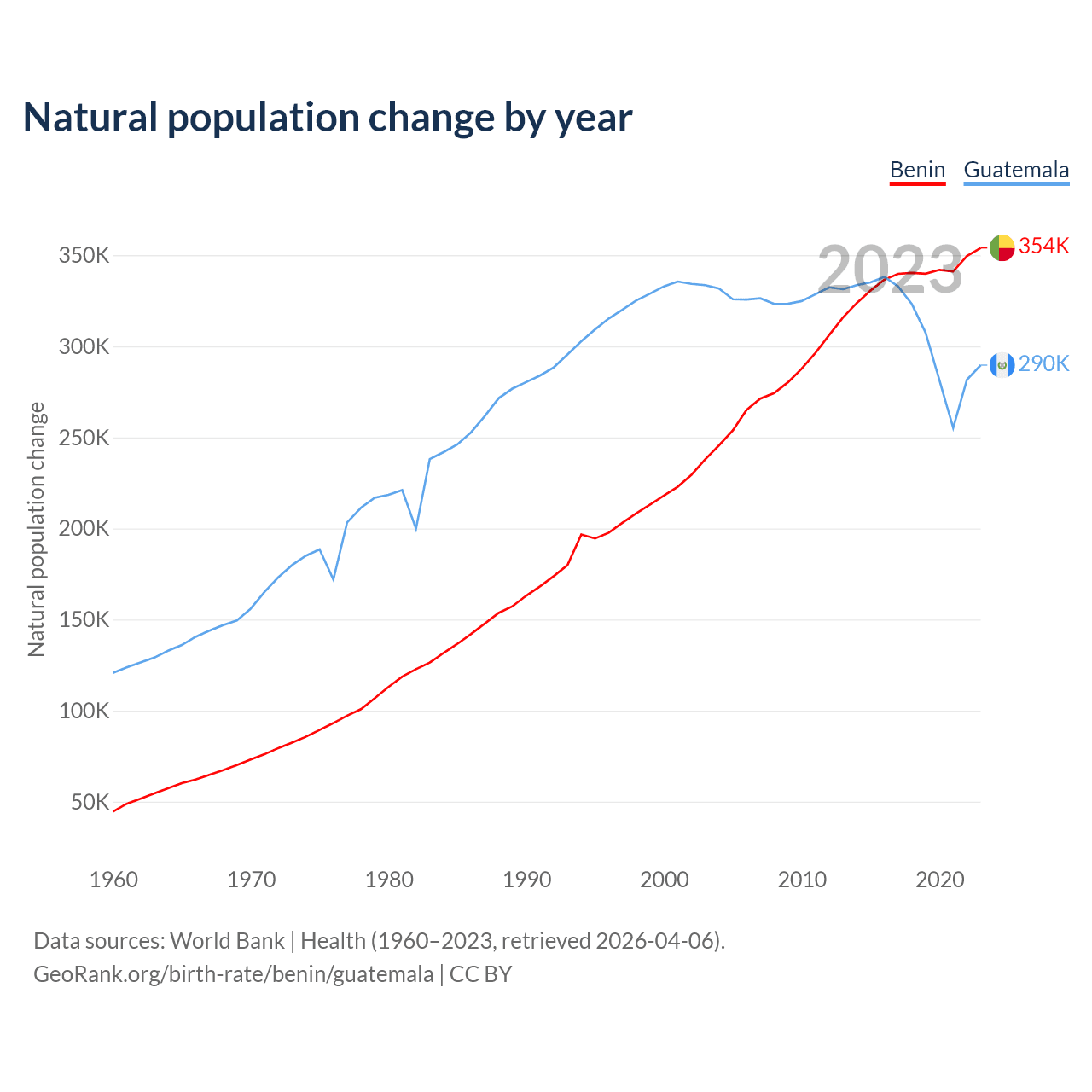 Benin has an annual birth rate of 33.9 births per 1,000 people, compared to 20.8 for Guatemala. The average number of children a woman is expected to have during her lifetime — the fertility rate, is 4.56 in Benin and 2.31 in Guatemala — 49.3% difference.