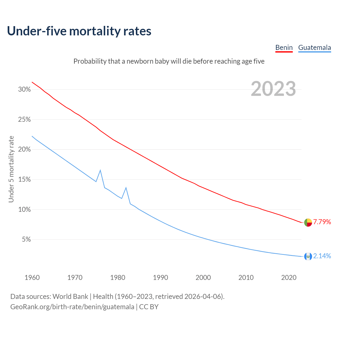 The chance that a newborn baby will die before reaching age five is 7.79% in Benin and 2.14% in Guatemala. Above is a chart with historical data on under-five mortality rates.