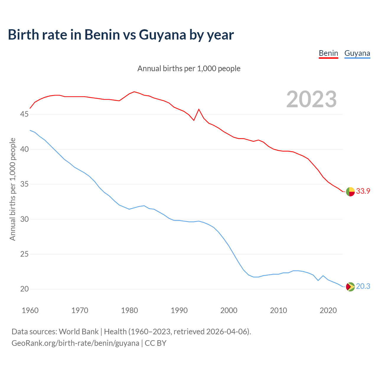 Benin has an annual birth rate of 33.9 births per 1,000 people, compared to 20.3 for Guyana. The average number of children a woman is expected to have during her lifetime — the fertility rate, is 4.56 in Benin and 2.41 in Guyana — 47.1% difference.