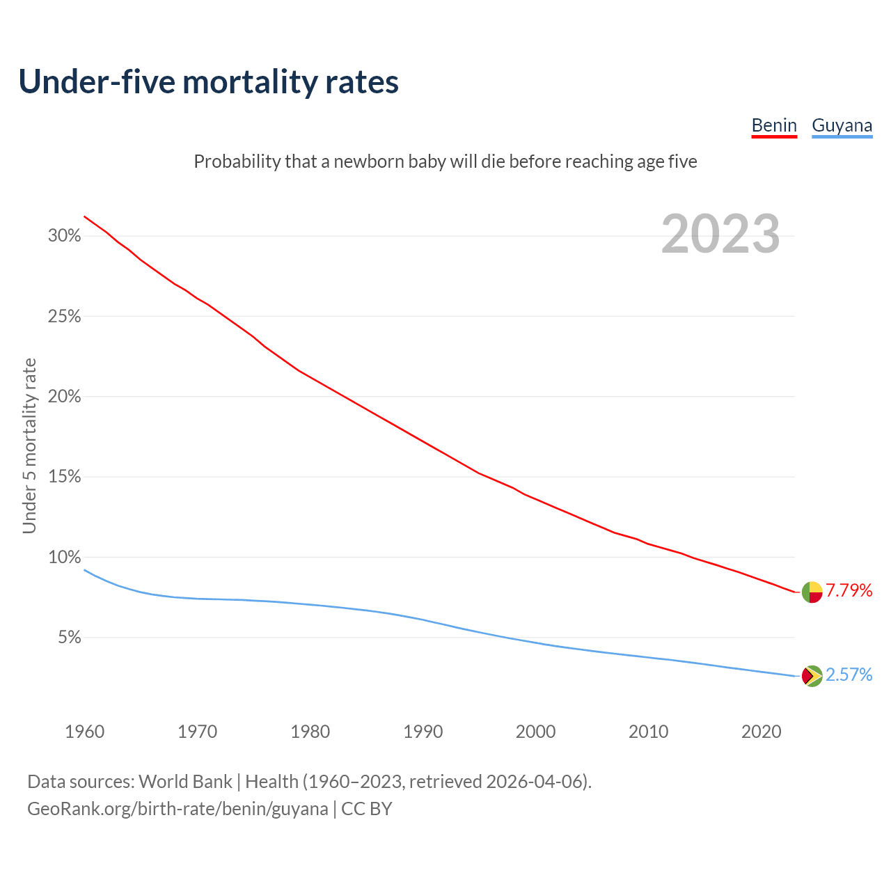 The chance that a newborn baby will die before reaching age five is 7.79% in Benin and 2.57% in Guyana. Above is a chart with historical data on under-five mortality rates.