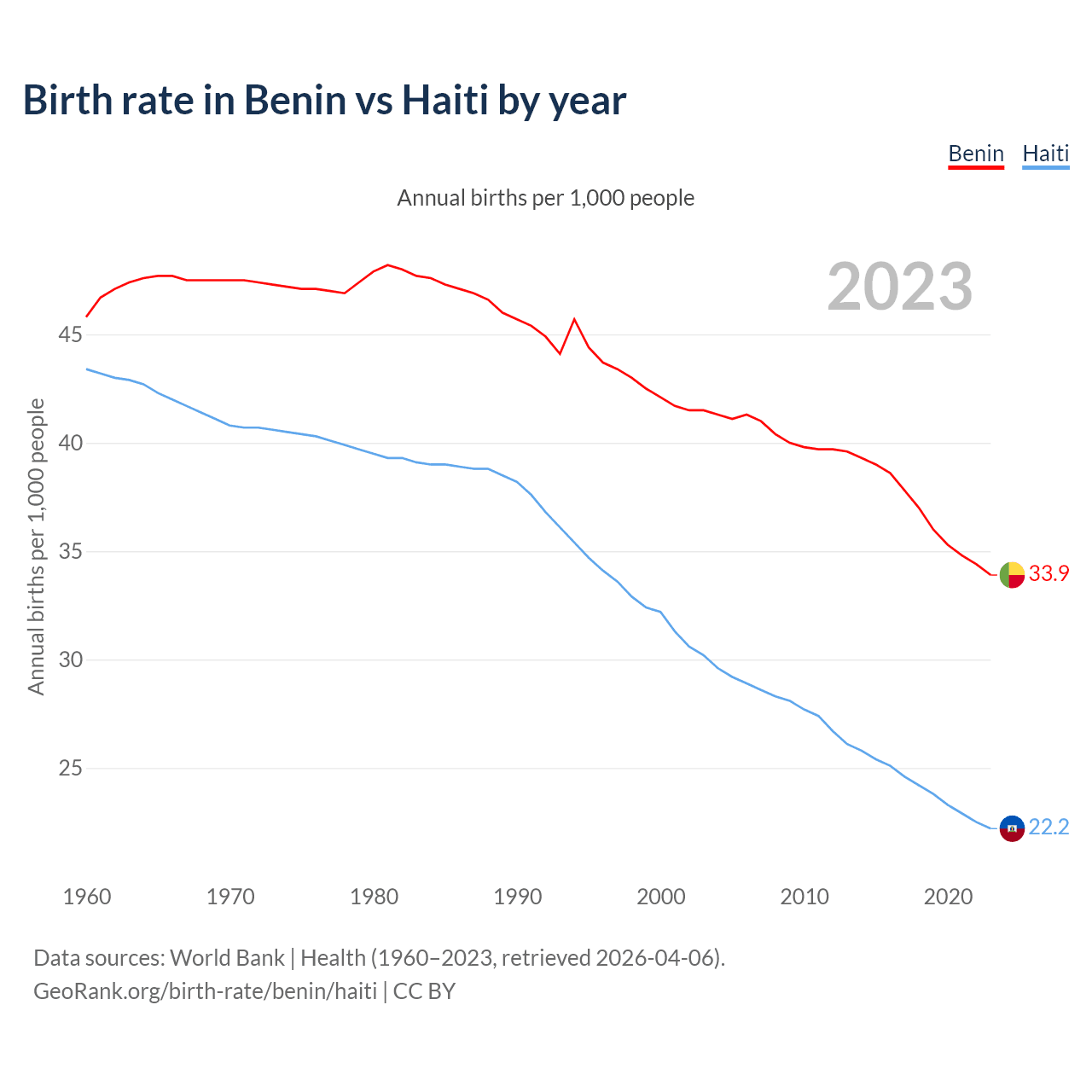 Benin has an annual birth rate of 33.9 births per 1,000 people, compared to 22.2 for Haiti. The average number of children a woman is expected to have during her lifetime — the fertility rate, is 4.56 in Benin and 2.66 in Haiti — 41.7% difference.