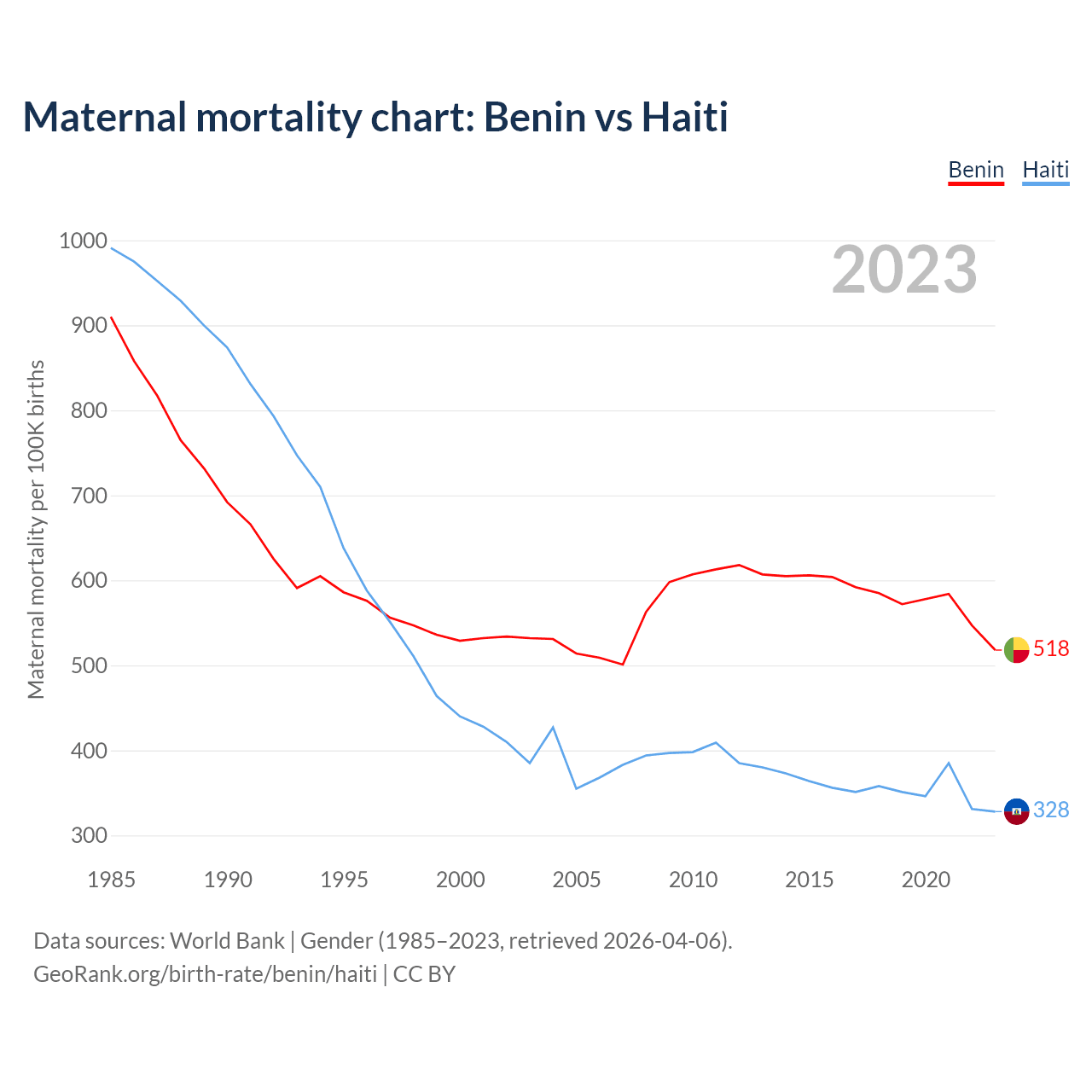The maternal mortality rate, which is the probability of dying during childbirth or within 42 days of pregnancy termination, is 518 deaths per 100,000 live births in Benin, compared to 328 deaths in Haiti.
