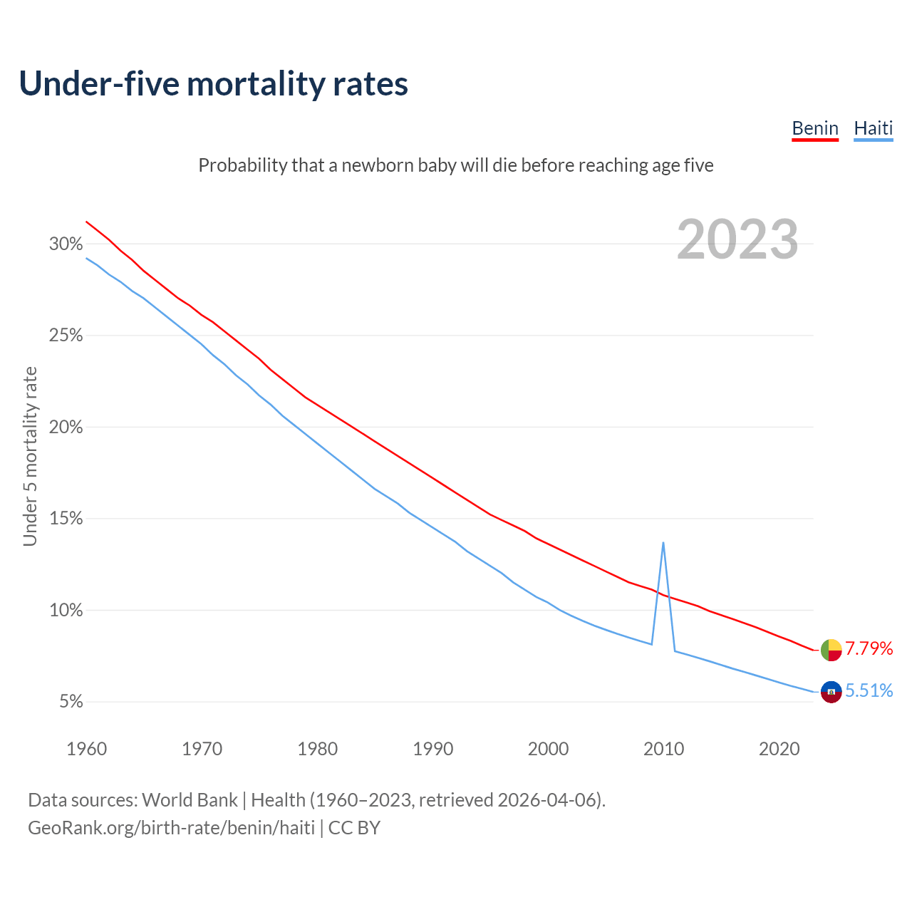 The chance that a newborn baby will die before reaching age five is 7.79% in Benin and 5.51% in Haiti. Above is a chart with historical data on under-five mortality rates.
