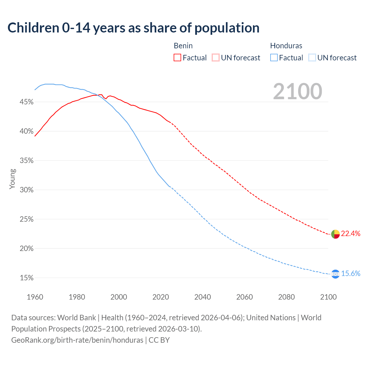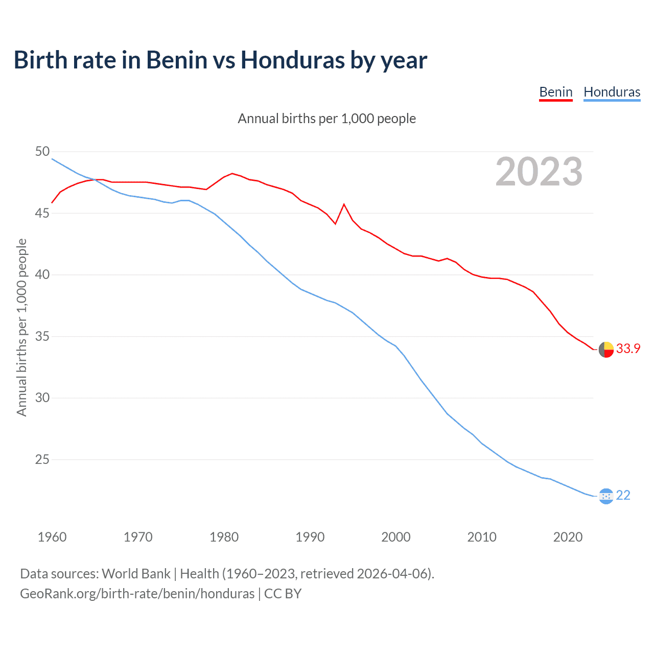 According to the latest available data on birth rates, the fertility rate in Benin was 4.56 children per woman in 2023, compared to 2.5 in Honduras in 2023. The replacement level is considered to be 2.1 children per woman.