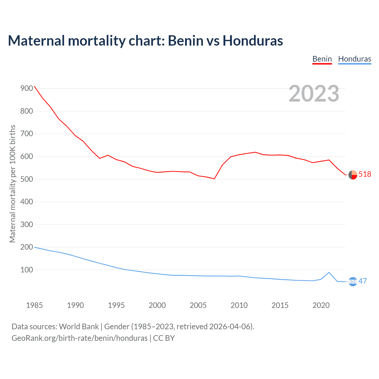 The maternal mortality rate, which is the probability of dying during childbirth or within 42 days of pregnancy termination, is 518 deaths per 100,000 live births in Benin, compared to 47 deaths in Honduras.
