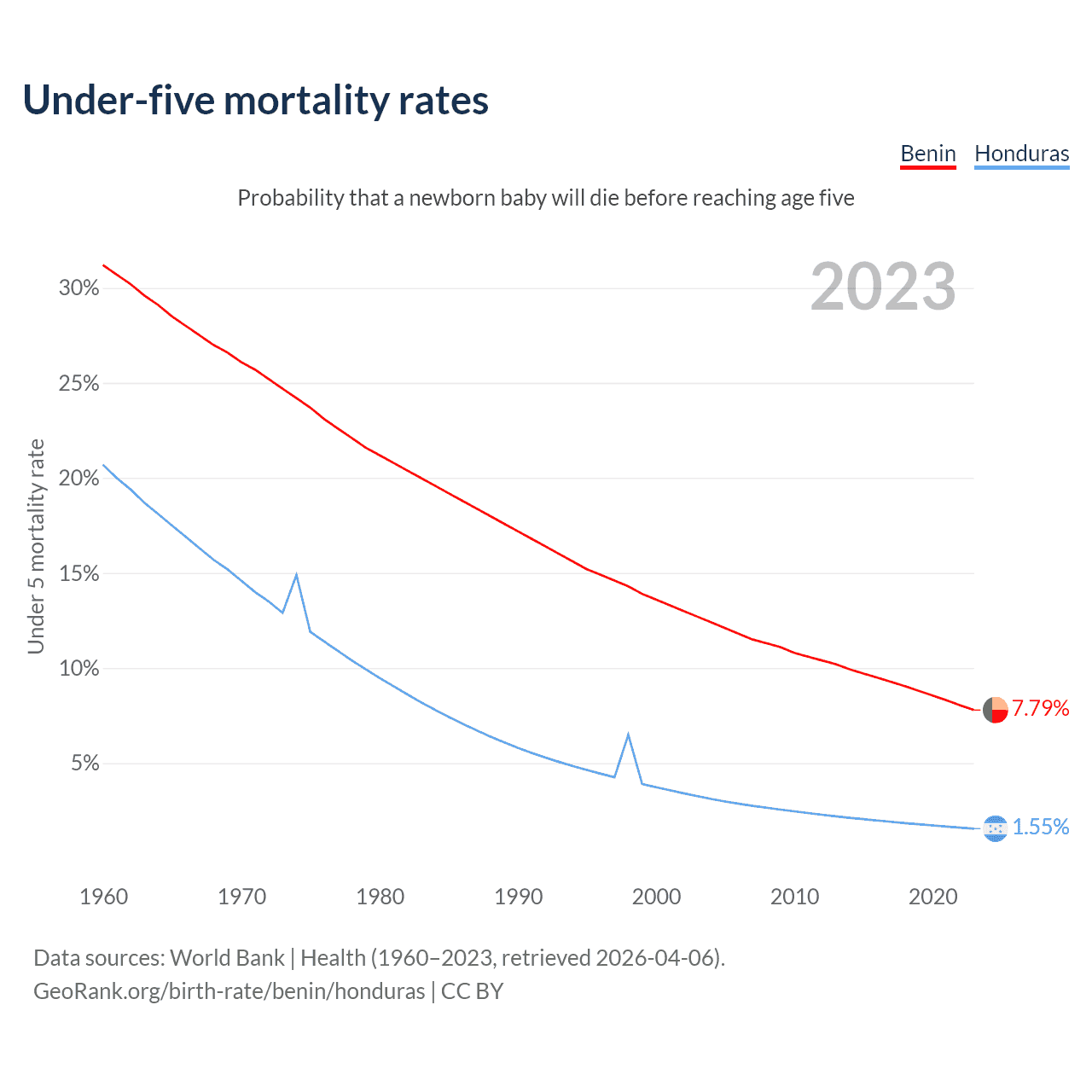 The chance that a newborn baby will die before reaching age five is 7.79% in Benin and 1.55% in Honduras. Above is a chart with historical data on under-five mortality rates.
