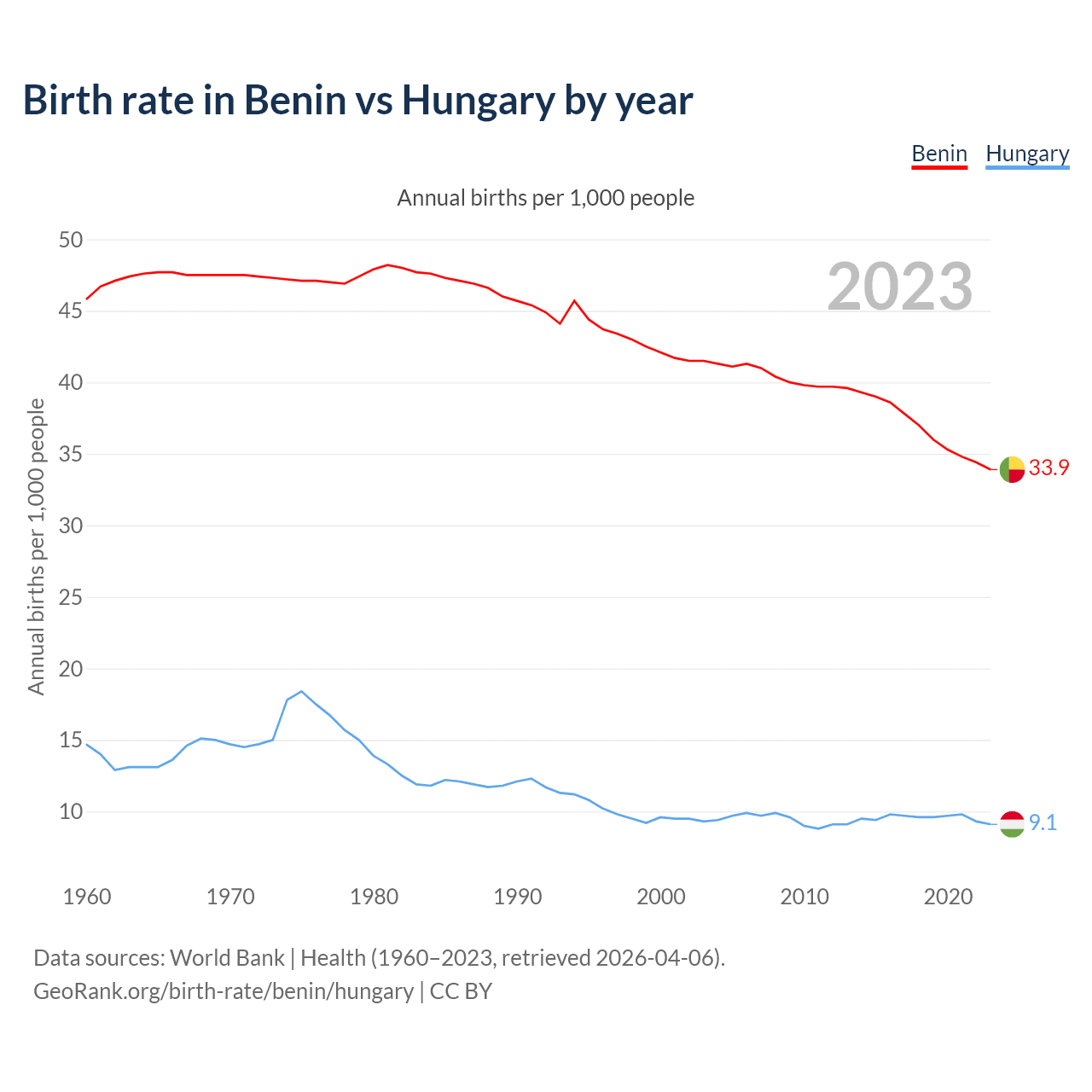 Benin has an annual birth rate of 33.9 births per 1,000 people, compared to 9.1 for Hungary. The average number of children a woman is expected to have during her lifetime — the fertility rate, is 4.56 in Benin and 1.51 in Hungary — 66.9% difference.