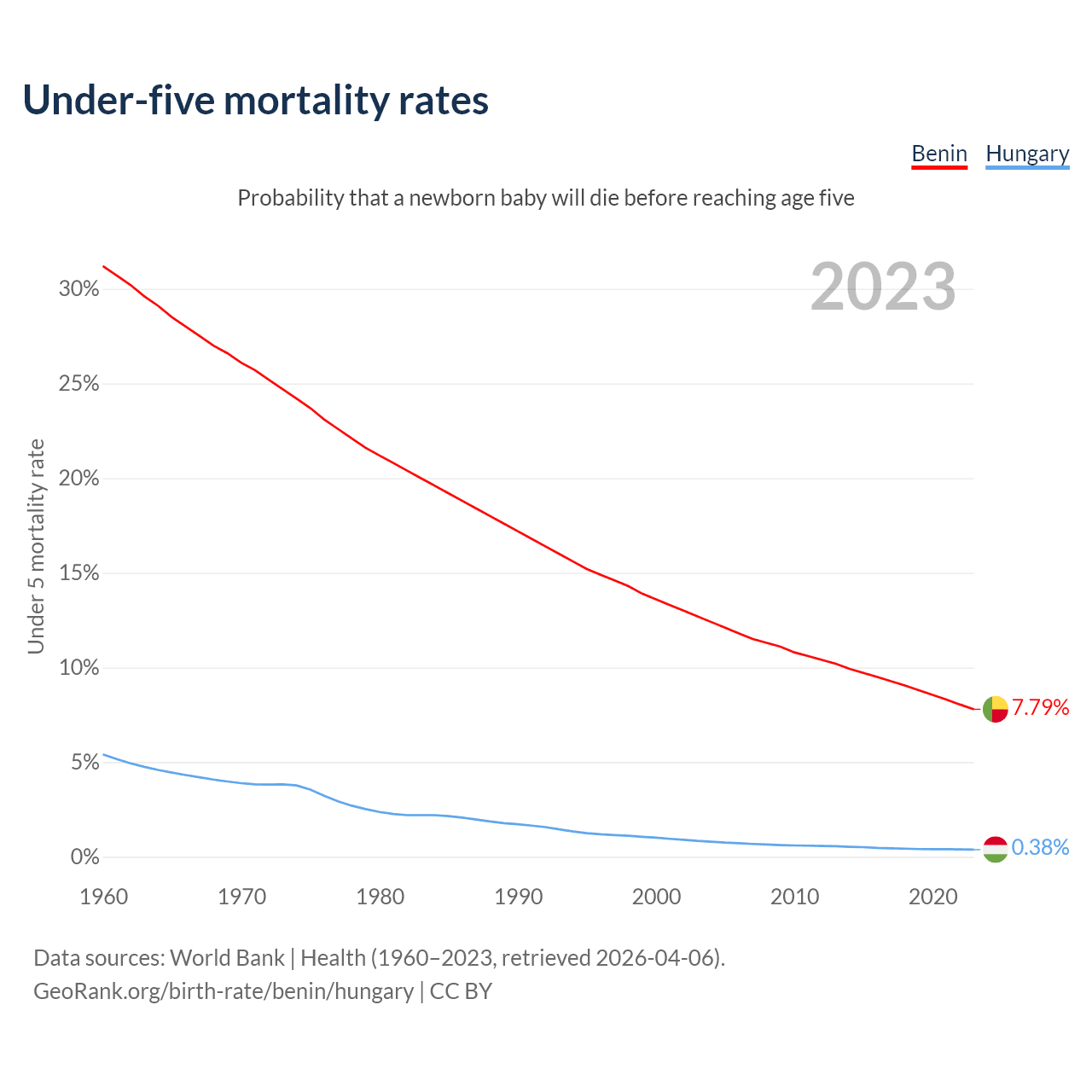 The chance that a newborn baby will die before reaching age five is 7.79% in Benin and 0.38% in Hungary. Above is a chart with historical data on under-five mortality rates.