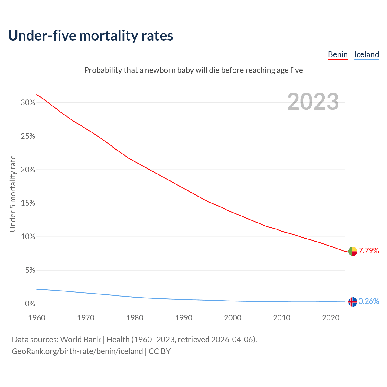 The chance that a newborn baby will die before reaching age five is 7.79% in Benin and 0.26% in Iceland. Above is a chart with historical data on under-five mortality rates.