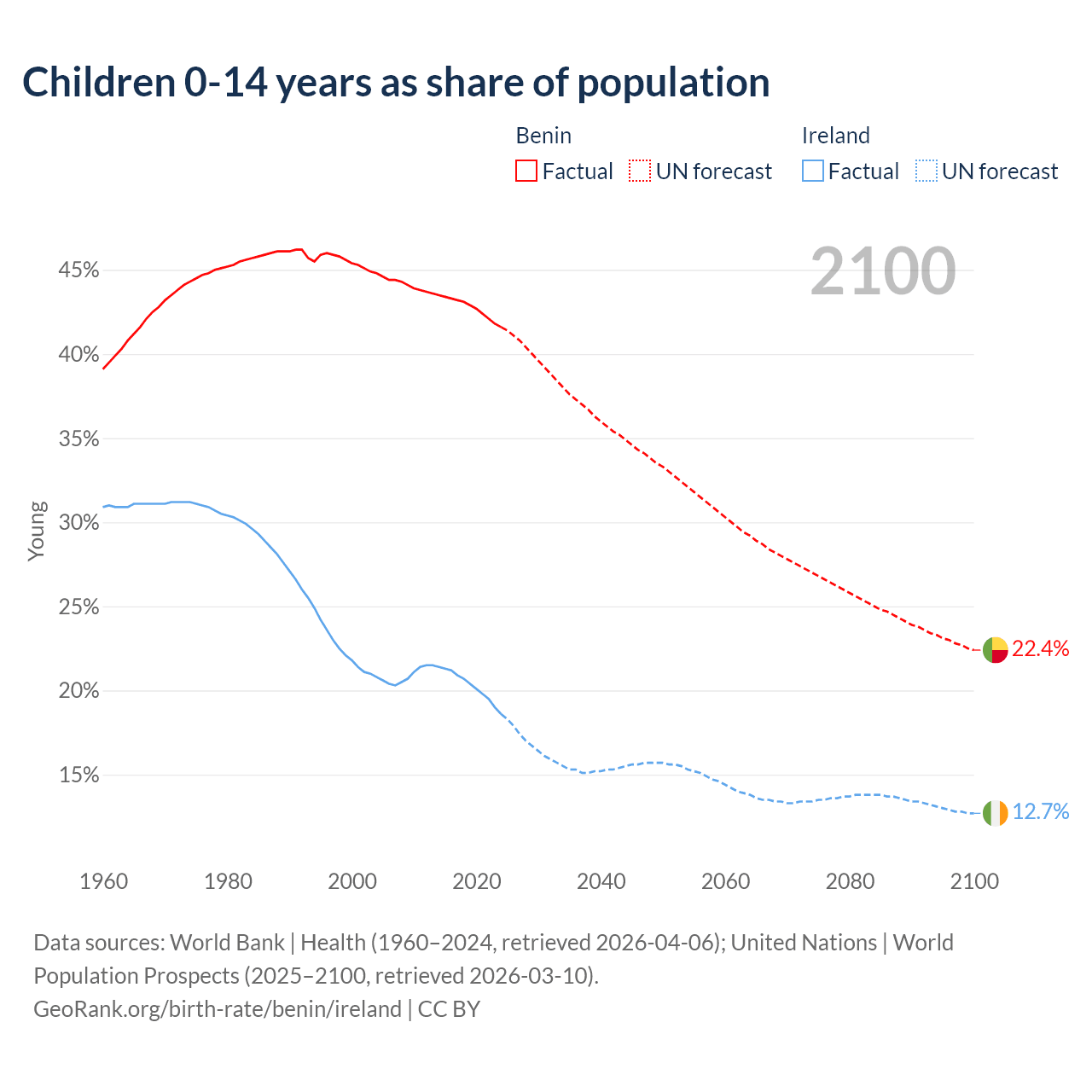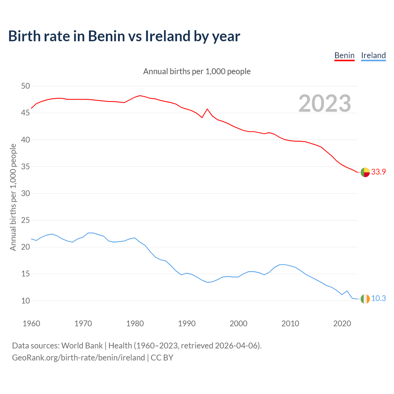 Benin has an annual birth rate of 33.9 births per 1,000 people, compared to 10.3 for Ireland. The average number of children a woman is expected to have during her lifetime — the fertility rate, is 4.56 in Benin and 1.5 in Ireland — 67.1% difference.