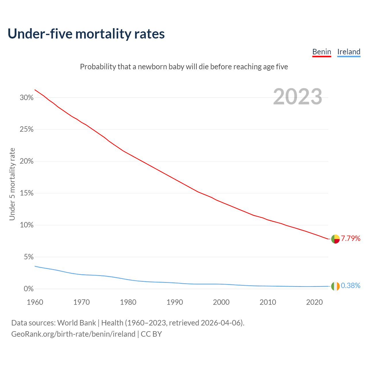 The chance that a newborn baby will die before reaching age five is 7.79% in Benin and 0.38% in Ireland. Above is a chart with historical data on under-five mortality rates.
