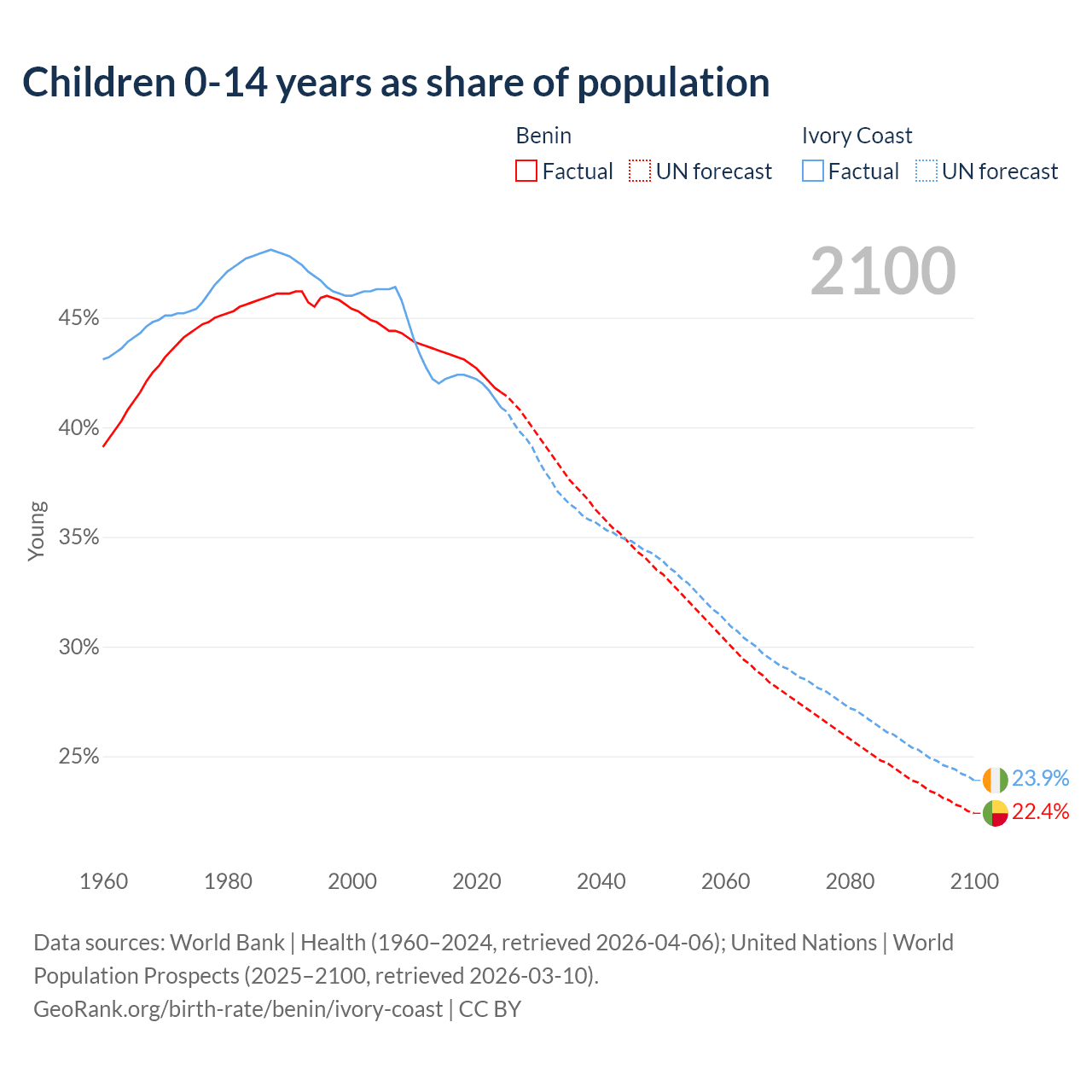 1960 vs 2023, the fertility rate has decreased by 27.5% in Benin and by 44.3% in Ivory Coast — in 1960, it was 6.28 and 7.69, respectively.