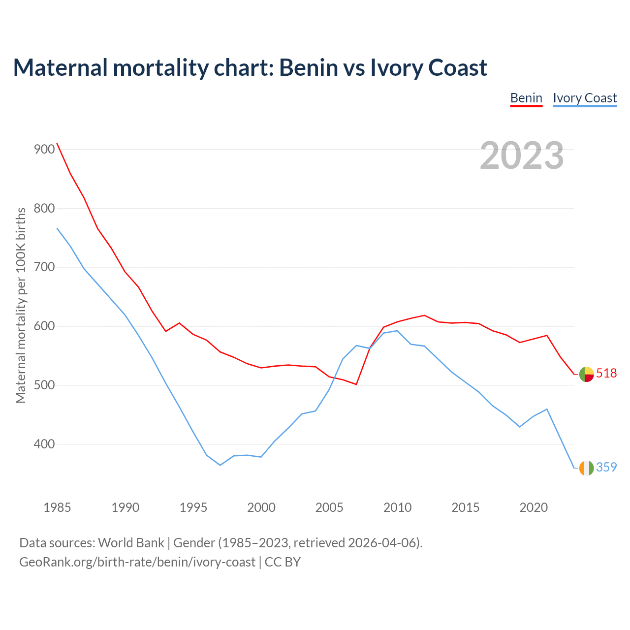 The maternal mortality rate, which is the probability of dying during childbirth or within 42 days of pregnancy termination, is 518 deaths per 100,000 live births in Benin, compared to 359 deaths in Ivory Coast.