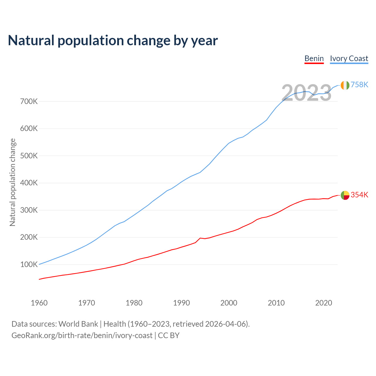 Check Benin vs Ivory Coast population clock for a dynamic visualization of the changing population.