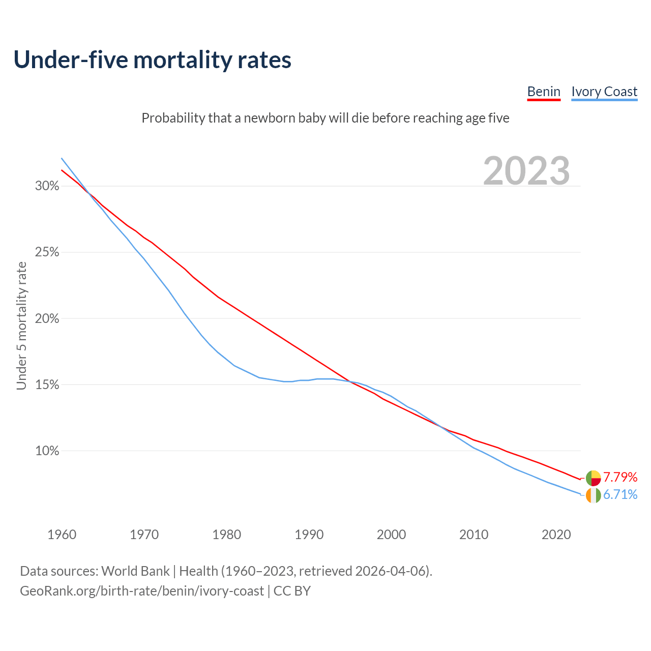 The chance that a newborn baby will die before reaching age five is 7.79% in Benin and 6.71% in Ivory Coast. Above is a chart with historical data on under-five mortality rates.