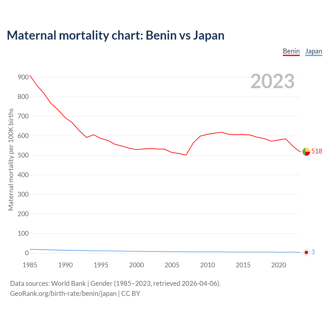 The maternal mortality rate, which is the probability of dying during childbirth or within 42 days of pregnancy termination, is 518 deaths per 100,000 live births in Benin, compared to 3 deaths in Japan.