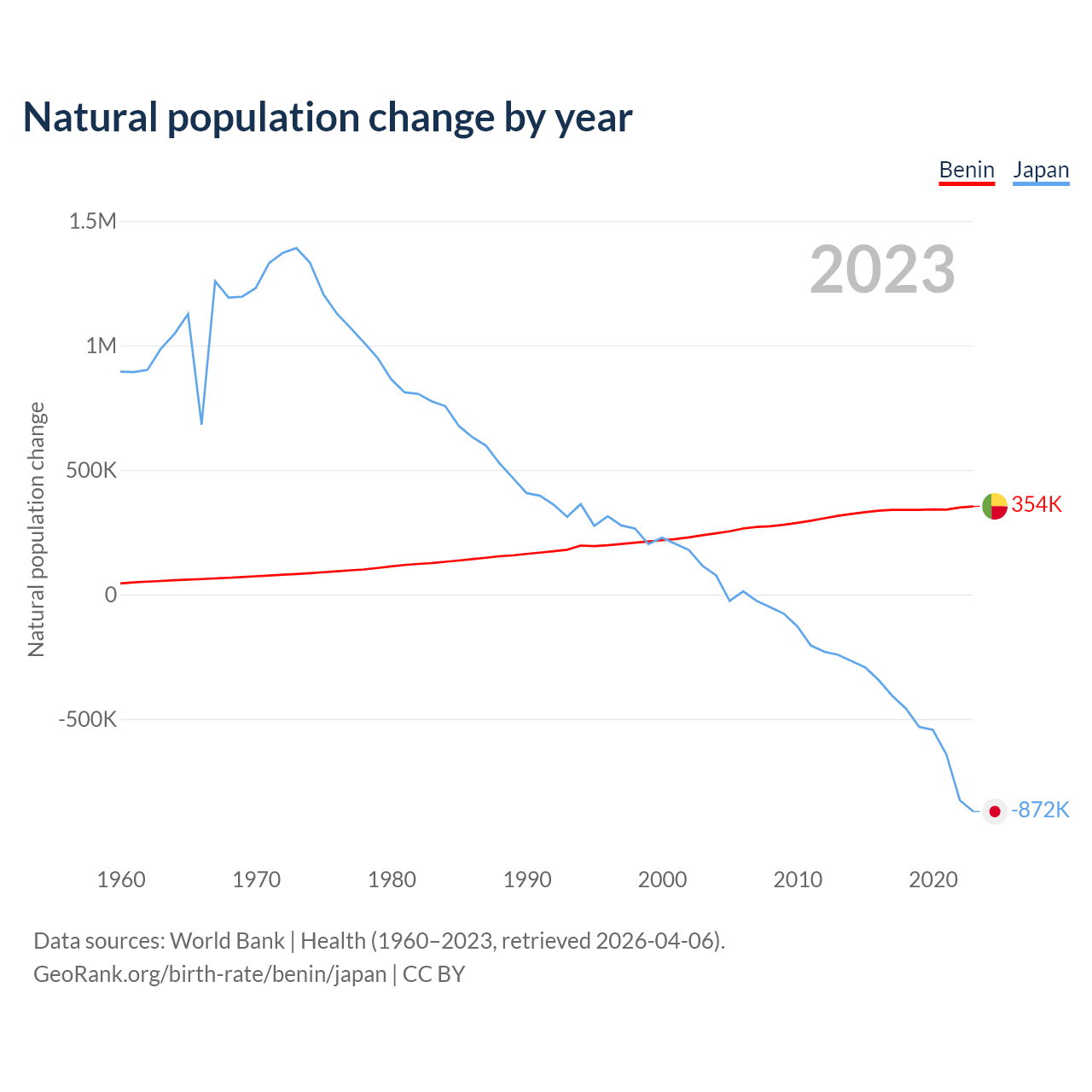 Benin has an annual birth rate of 33.9 births per 1,000 people, compared to 6 for Japan. The average number of children a woman is expected to have during her lifetime — the fertility rate, is 4.56 in Benin and 1.2 in Japan — 73.7% difference.
