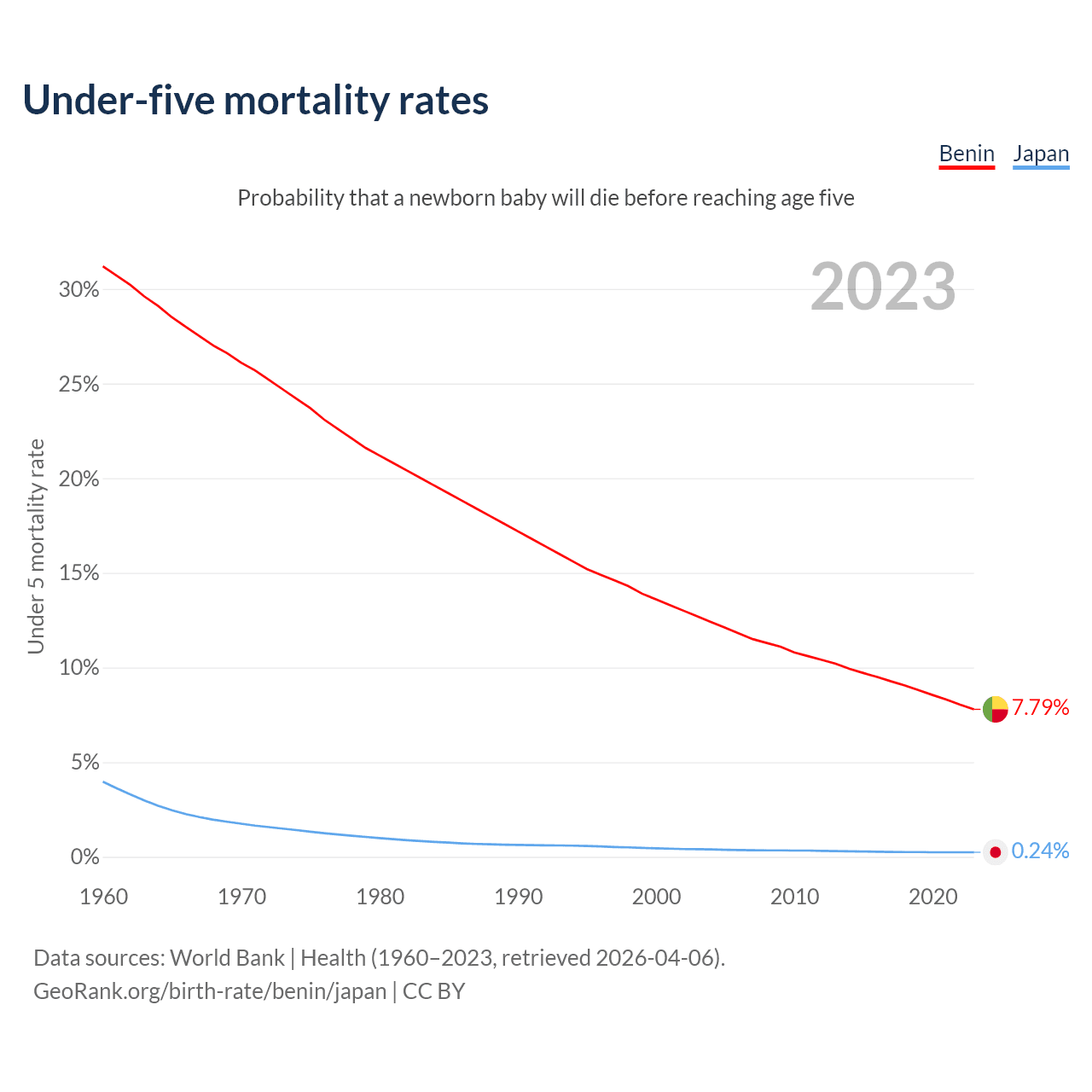 The chance that a newborn baby will die before reaching age five is 7.79% in Benin and 0.24% in Japan. Above is a chart with historical data on under-five mortality rates.