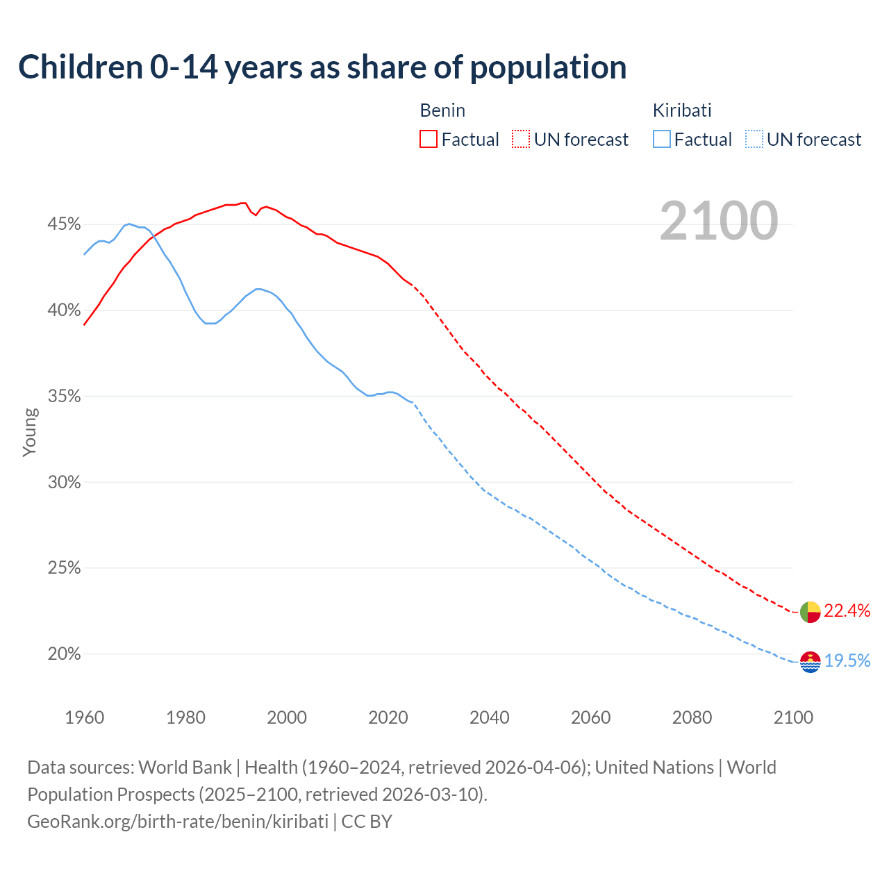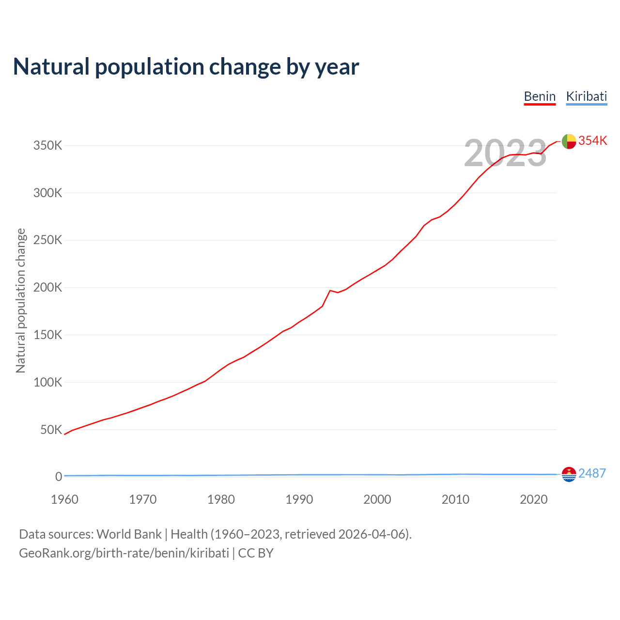 According to the latest available data on birth rates, the fertility rate in Benin was 4.56 children per woman in 2023, compared to 3.15 in Kiribati in 2023. The replacement level is considered to be 2.1 children per woman.