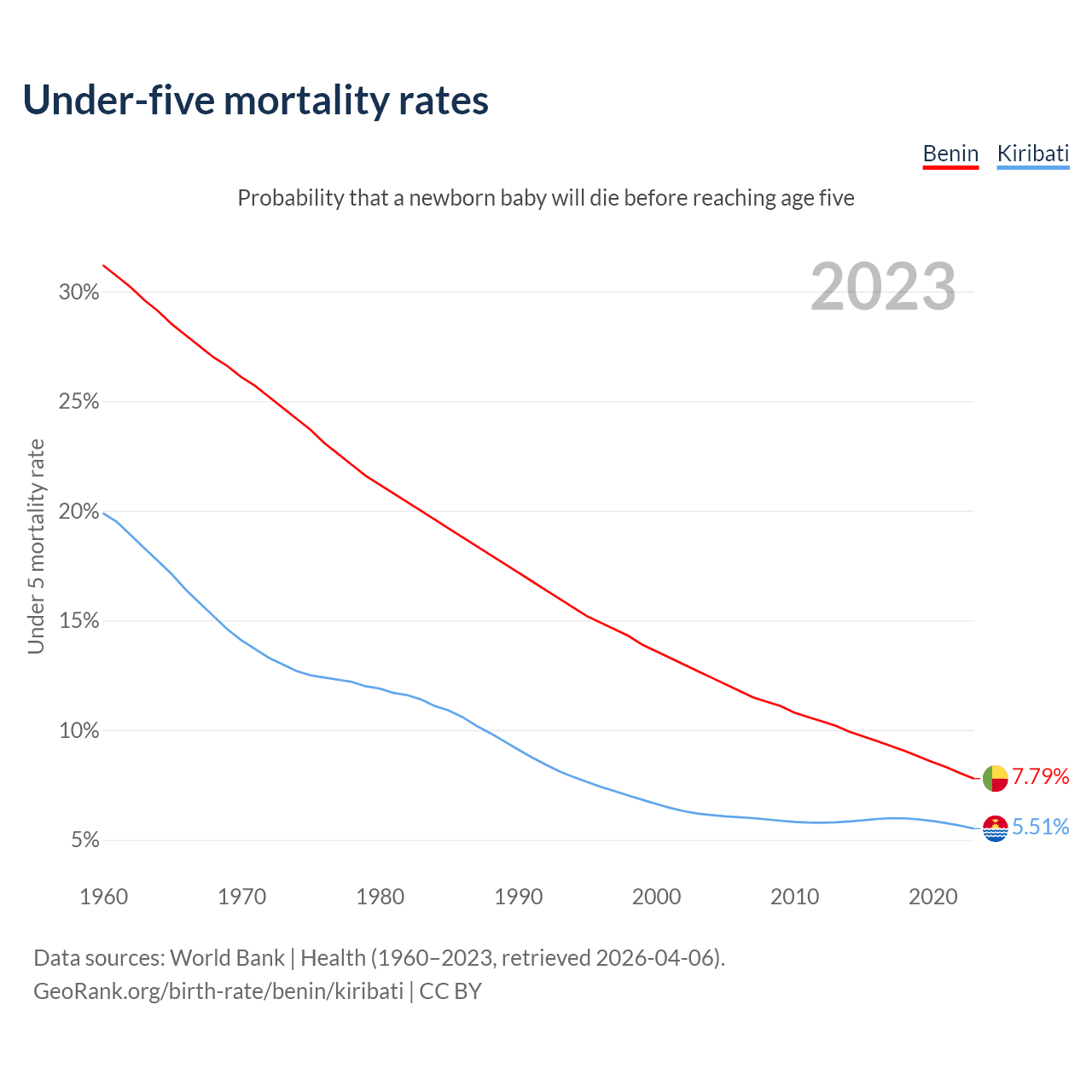 The chance that a newborn baby will die before reaching age five is 7.79% in Benin and 5.51% in Kiribati. Above is a chart with historical data on under-five mortality rates.