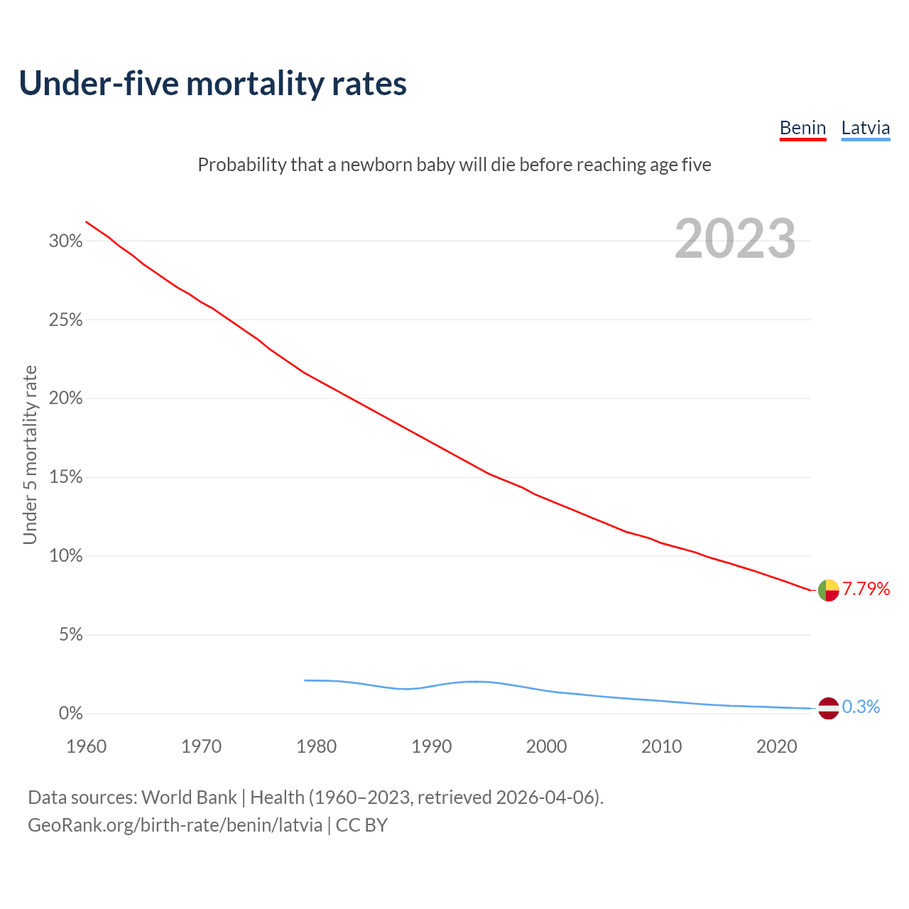 The chance that a newborn baby will die before reaching age five is 7.79% in Benin and 0.3% in Latvia. Above is a chart with historical data on under-five mortality rates.