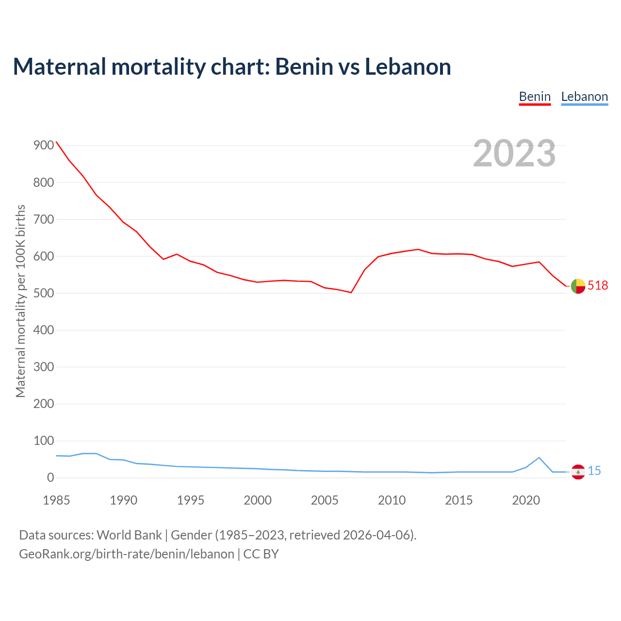 The maternal mortality rate, which is the probability of dying during childbirth or within 42 days of pregnancy termination, is 518 deaths per 100,000 live births in Benin, compared to 15 deaths in Lebanon.