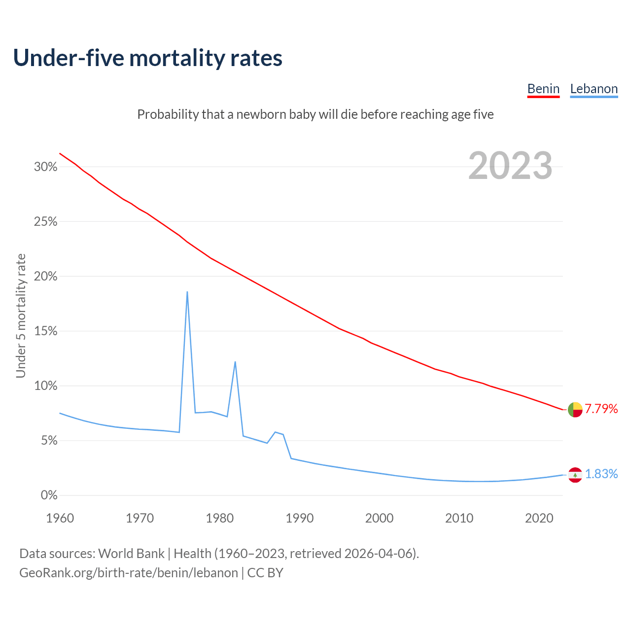 The chance that a newborn baby will die before reaching age five is 7.79% in Benin and 1.83% in Lebanon. Above is a chart with historical data on under-five mortality rates.