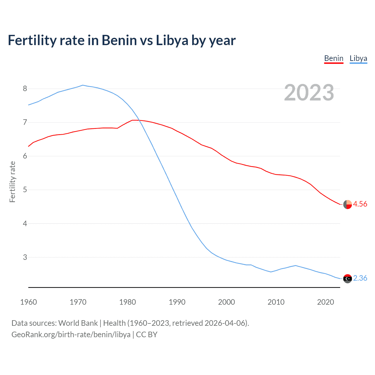 1960 vs 2023, the fertility rate has decreased by 27.5% in Benin and by 68.6% in Libya — in 1960, it was 6.28 and 7.51, respectively.