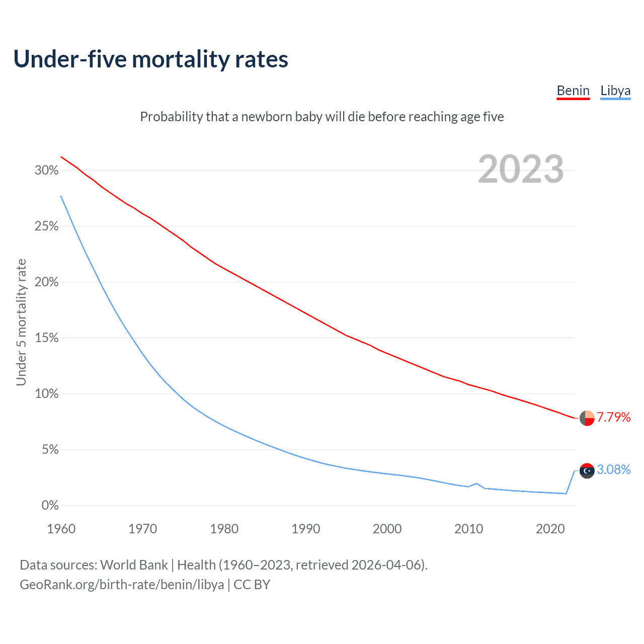 The chance that a newborn baby will die before reaching age five is 7.79% in Benin and 3.08% in Libya. Above is a chart with historical data on under-five mortality rates.
