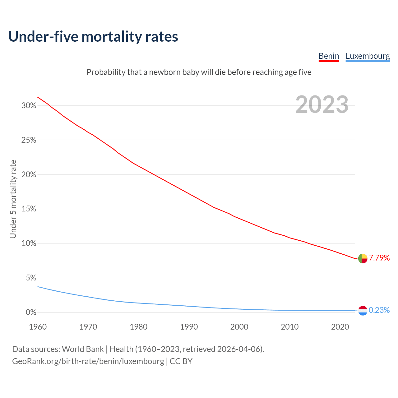 The chance that a newborn baby will die before reaching age five is 7.79% in Benin and 0.23% in Luxembourg. Above is a chart with historical data on under-five mortality rates.