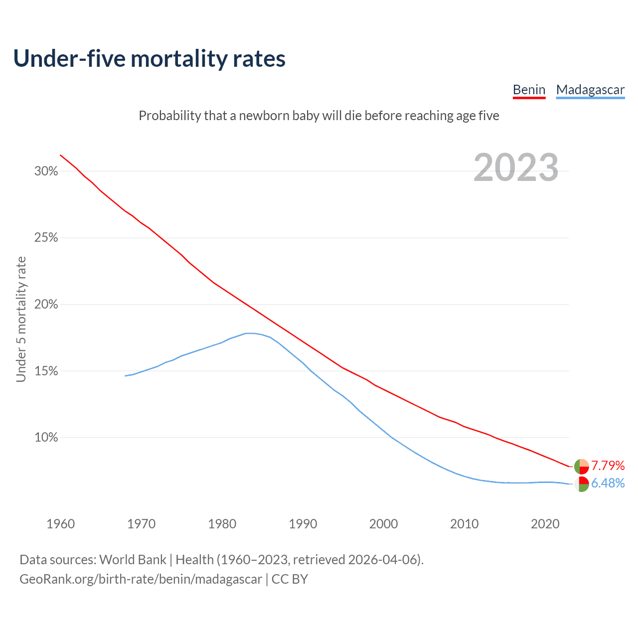 The chance that a newborn baby will die before reaching age five is 7.79% in Benin and 6.48% in Madagascar. Above is a chart with historical data on under-five mortality rates.