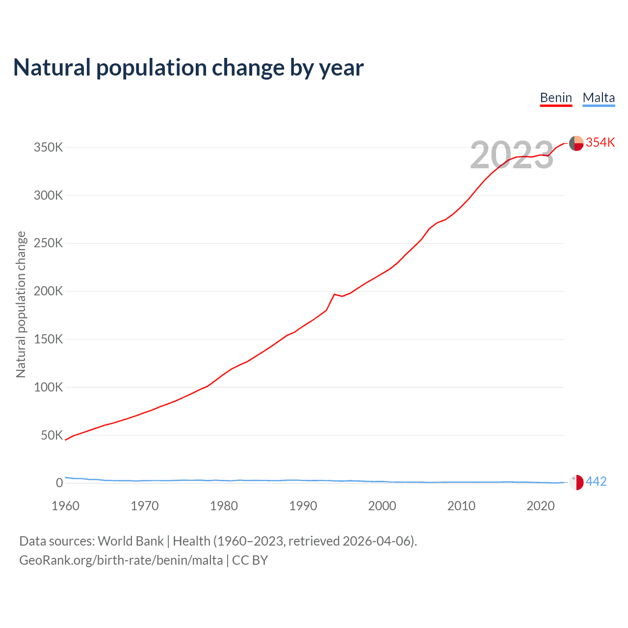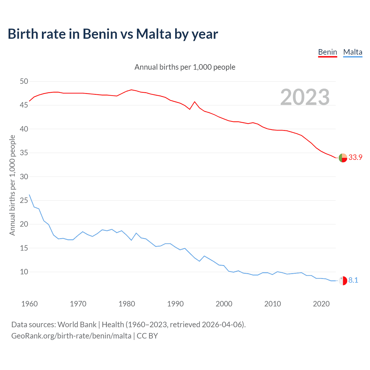 Benin has an annual birth rate of 33.9 births per 1,000 people, compared to 8.1 for Malta. The average number of children a woman is expected to have during her lifetime — the fertility rate, is 4.56 in Benin and 1.06 in Malta — 76.7% difference.