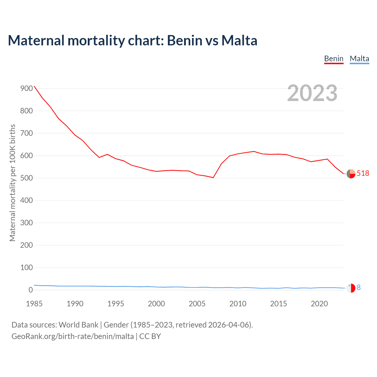 The maternal mortality rate, which is the probability of dying during childbirth or within 42 days of pregnancy termination, is 518 deaths per 100,000 live births in Benin, compared to 8 deaths in Malta.