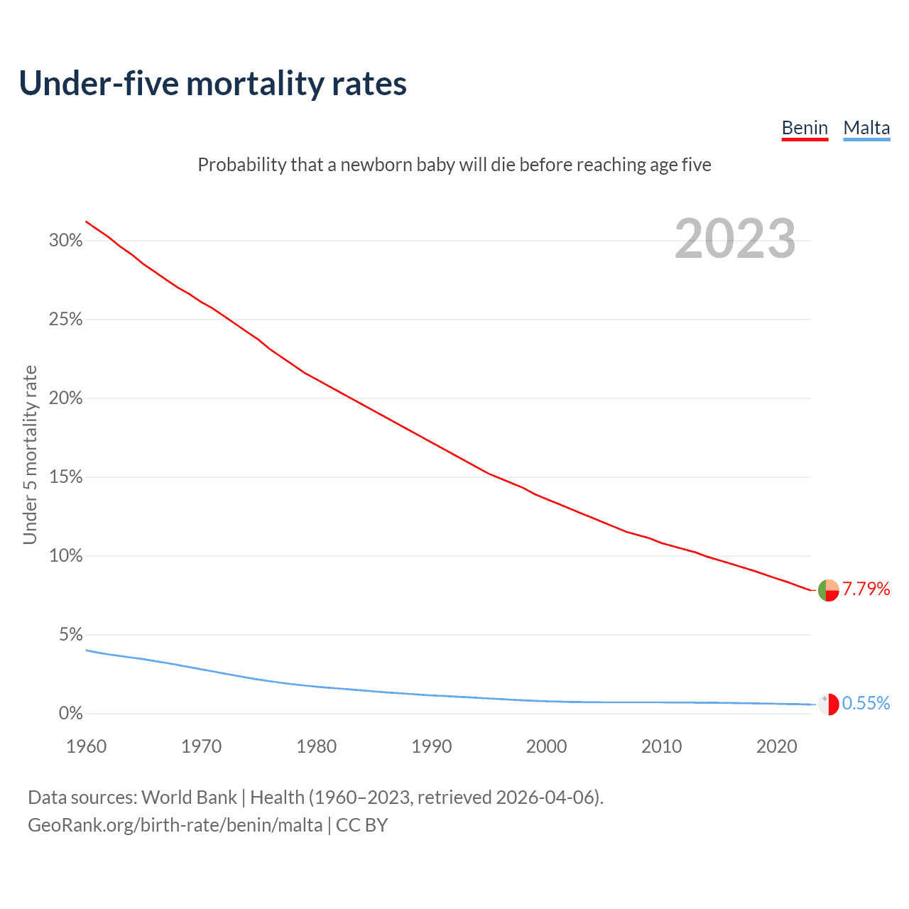 The chance that a newborn baby will die before reaching age five is 7.79% in Benin and 0.55% in Malta. Above is a chart with historical data on under-five mortality rates.