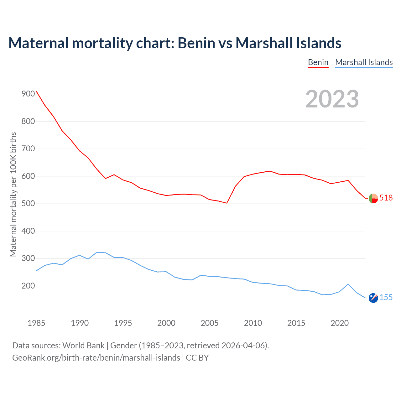 The maternal mortality rate, which is the probability of dying during childbirth or within 42 days of pregnancy termination, is 518 deaths per 100,000 live births in Benin, compared to 155 deaths in the Marshall Islands.