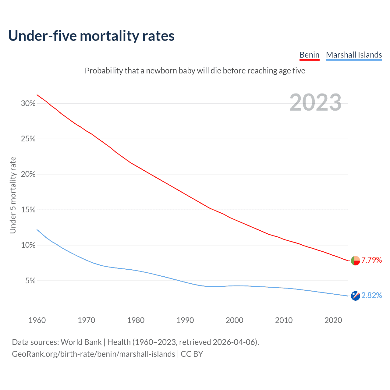 The chance that a newborn baby will die before reaching age five is 7.79% in Benin and 2.82% in the Marshall Islands. Above is a chart with historical data on under-five mortality rates.