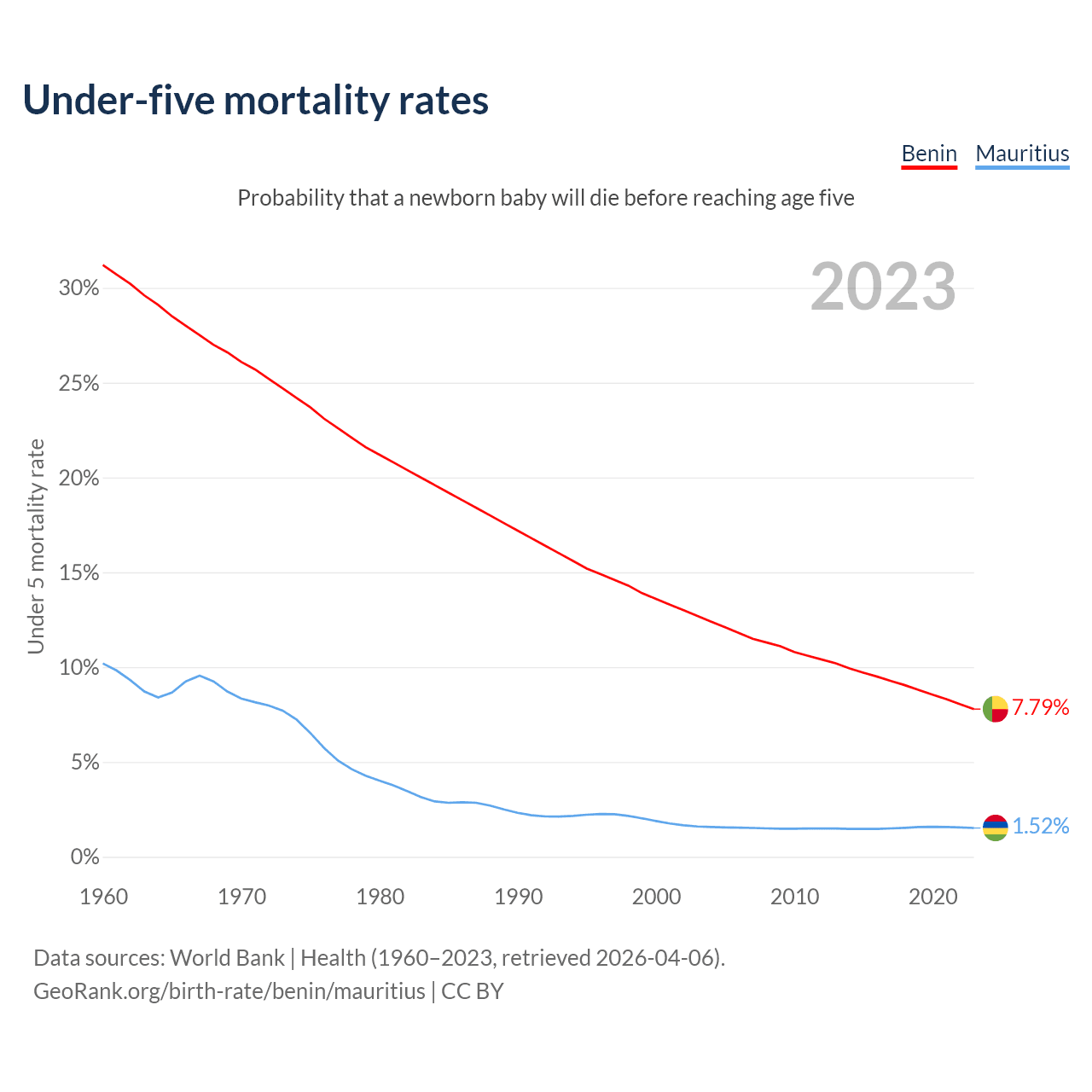 The chance that a newborn baby will die before reaching age five is 7.79% in Benin and 1.52% in Mauritius. Above is a chart with historical data on under-five mortality rates.