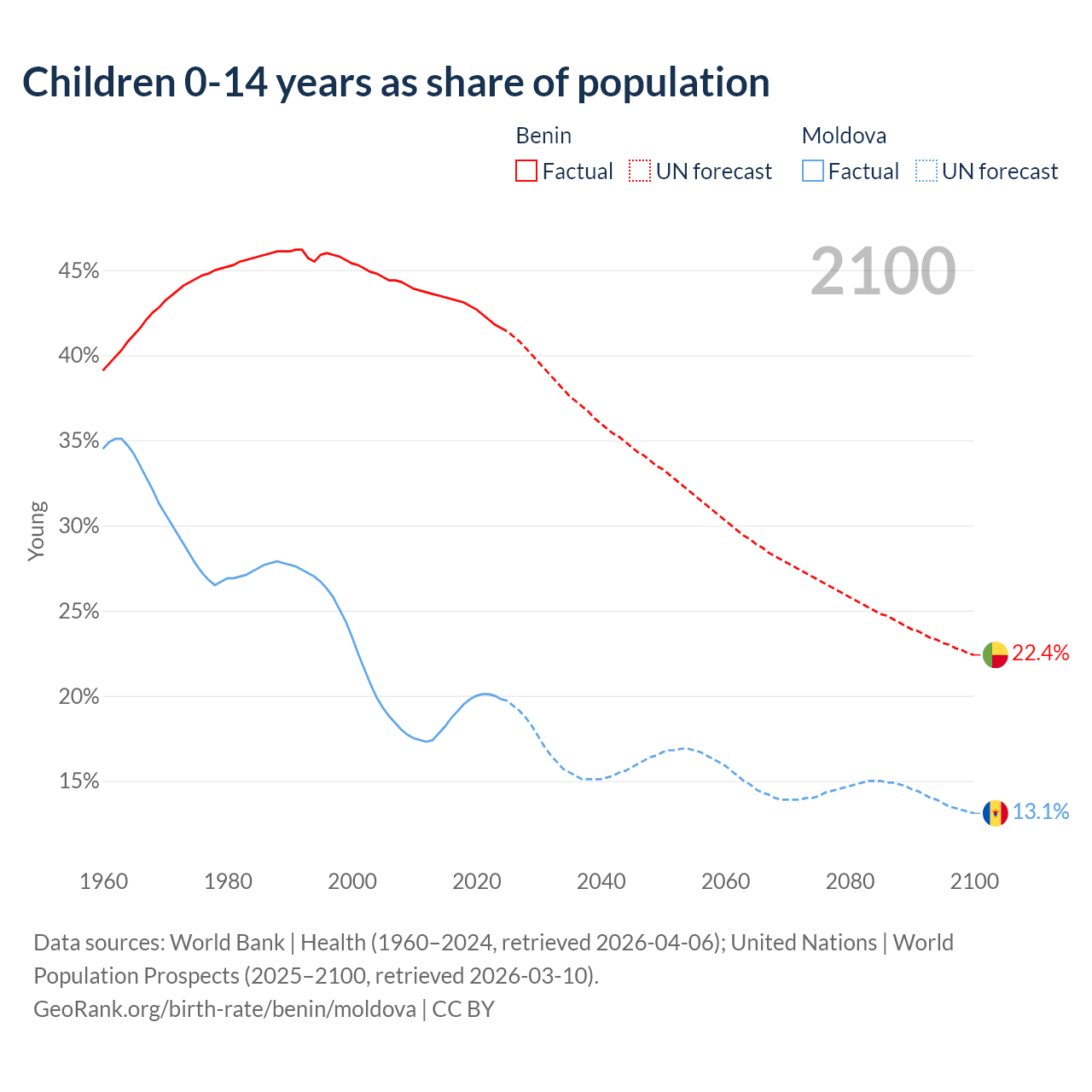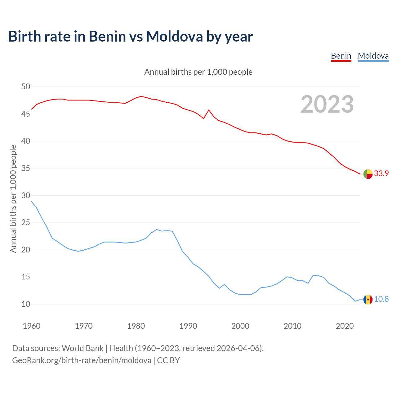 Benin has an annual birth rate of 33.9 births per 1,000 people, compared to 10.8 for Moldova. The average number of children a woman is expected to have during her lifetime — the fertility rate, is 4.56 in Benin and 1.73 in Moldova — 62% difference.
