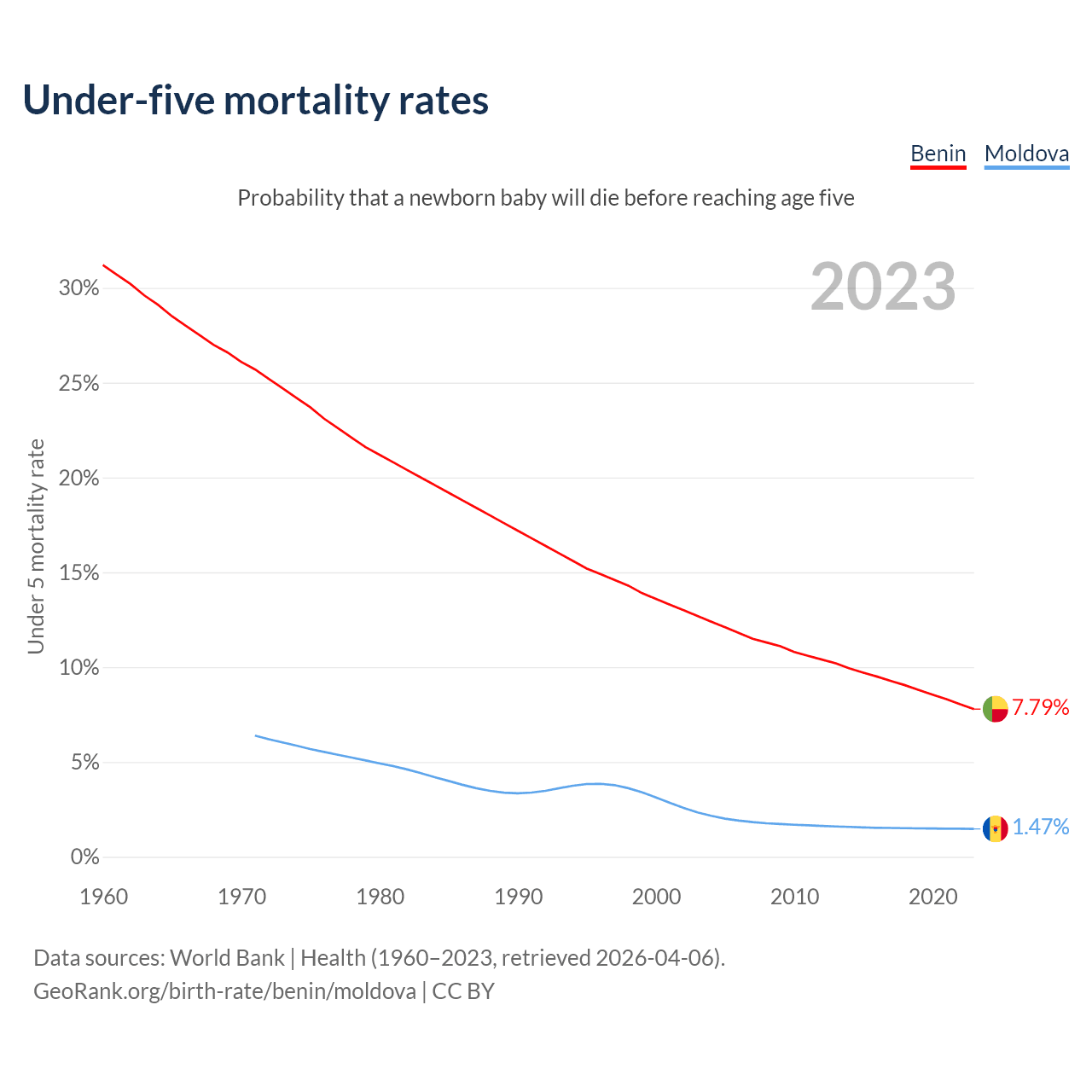 The chance that a newborn baby will die before reaching age five is 7.79% in Benin and 1.47% in Moldova. Above is a chart with historical data on under-five mortality rates.