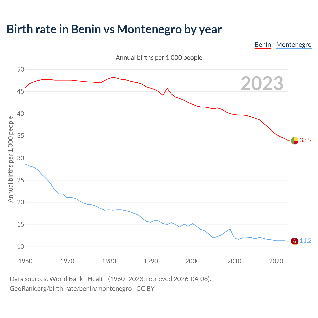 Benin has an annual birth rate of 33.9 births per 1,000 people, compared to 11.2 for Montenegro. The average number of children a woman is expected to have during her lifetime — the fertility rate, is 4.56 in Benin and 1.74 in Montenegro — 61.8% difference.