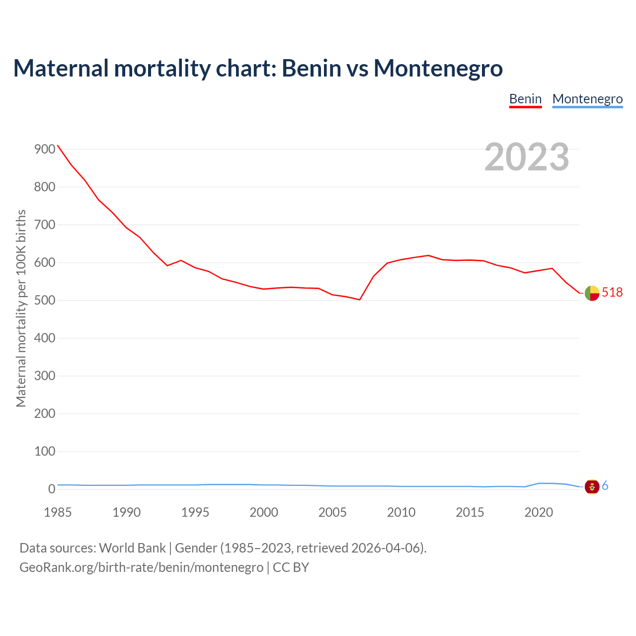 The maternal mortality rate, which is the probability of dying during childbirth or within 42 days of pregnancy termination, is 518 deaths per 100,000 live births in Benin, compared to 6 deaths in Montenegro.