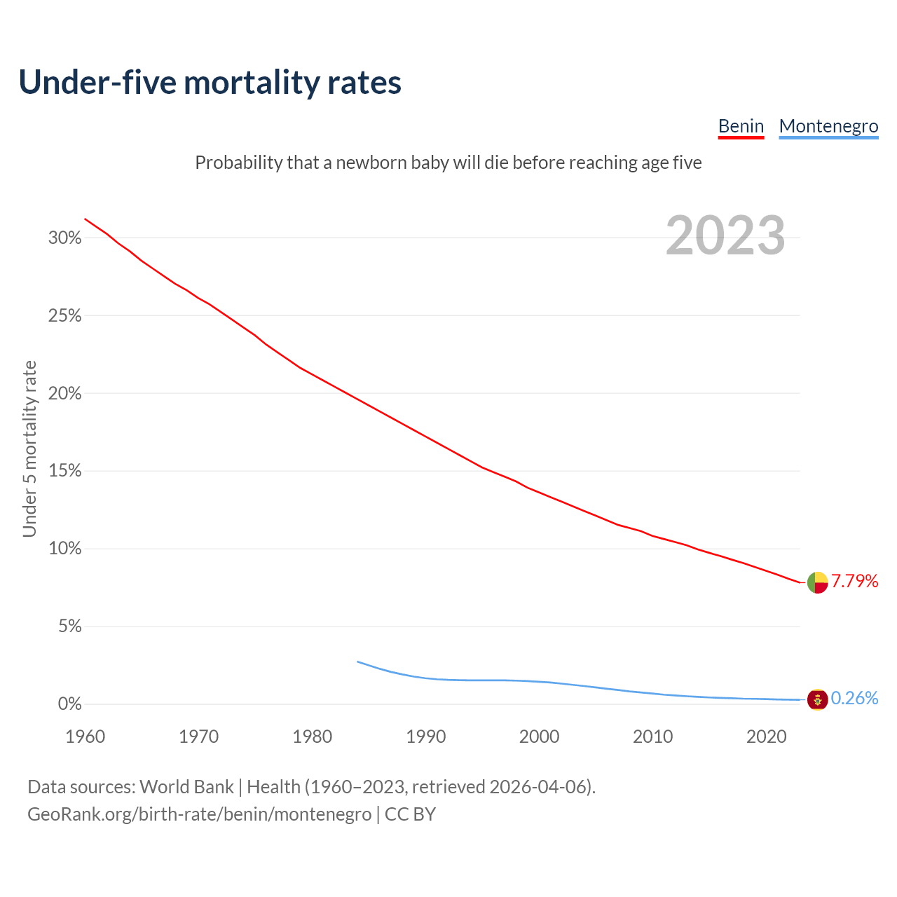 The chance that a newborn baby will die before reaching age five is 7.79% in Benin and 0.26% in Montenegro. Above is a chart with historical data on under-five mortality rates.